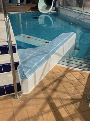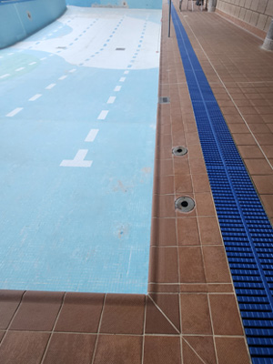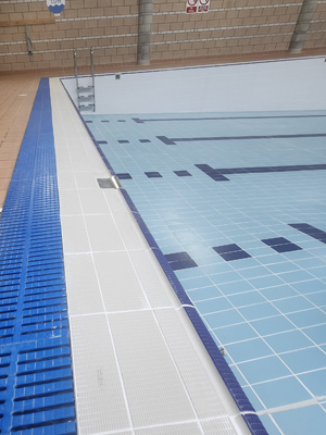 Our dedicated swimming pool refurbishment team stripped the 600sqm pool tank along with the poolside handgrip tiles and backing tiles up to the overflow channels.