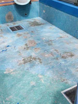 UK Diveworks Managing Director Andrew Wilkins attended site and discussed the options available to our client. Information was shared about the existing structure, the existing usage of the pool and also the installation of the liner which had failed. Upon the fact find being completed, it was deemed that the most cost effective and guaranteed way to remedy the issues for our client would be to complete a full pool strip out including the remaining lining and mosaic tiling beneath. Surface preparation would be completed and new tanking installed to the surfaces of all wet areas. A vitrified tile would then be selected specific for swimming pool installation and installed using swimming pool graded products.